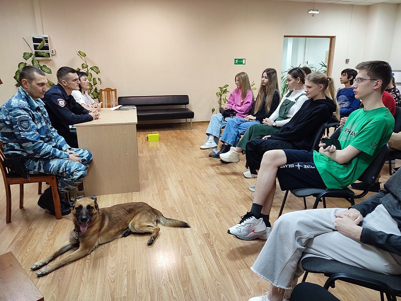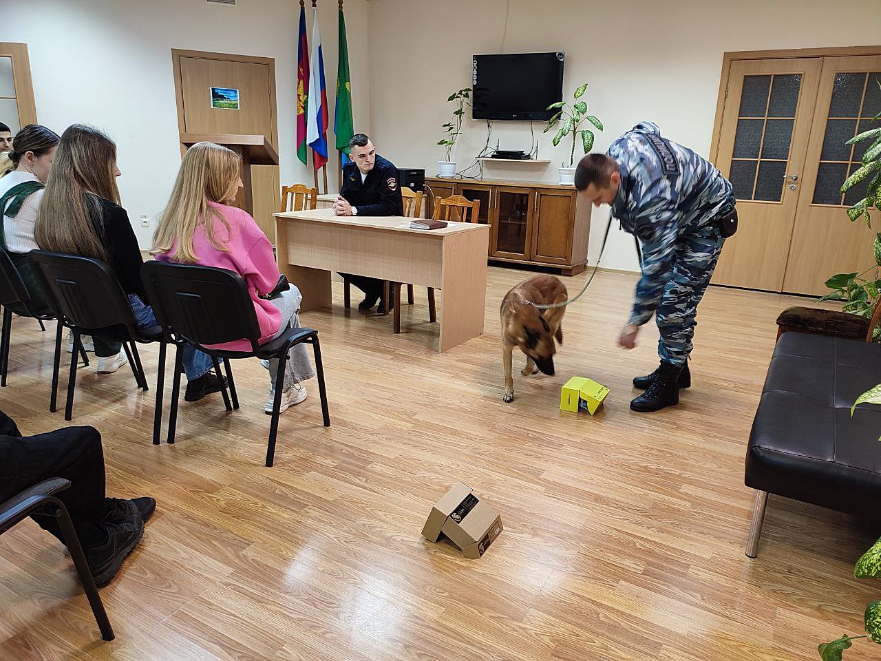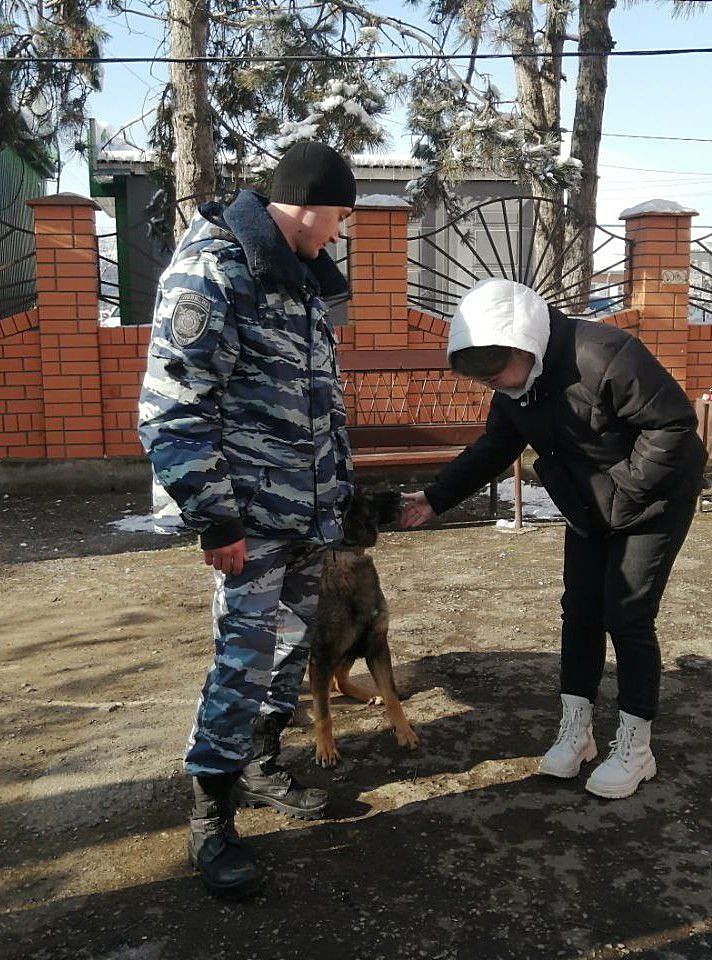 Сотрудники кинологической службы познакомили студентов с полицейской собакой Гердой, обученной для поиска запрещенных препаратов, и, при помощи специального имитатора наркотических средств, продемонстрировали процесс их обнаружения.